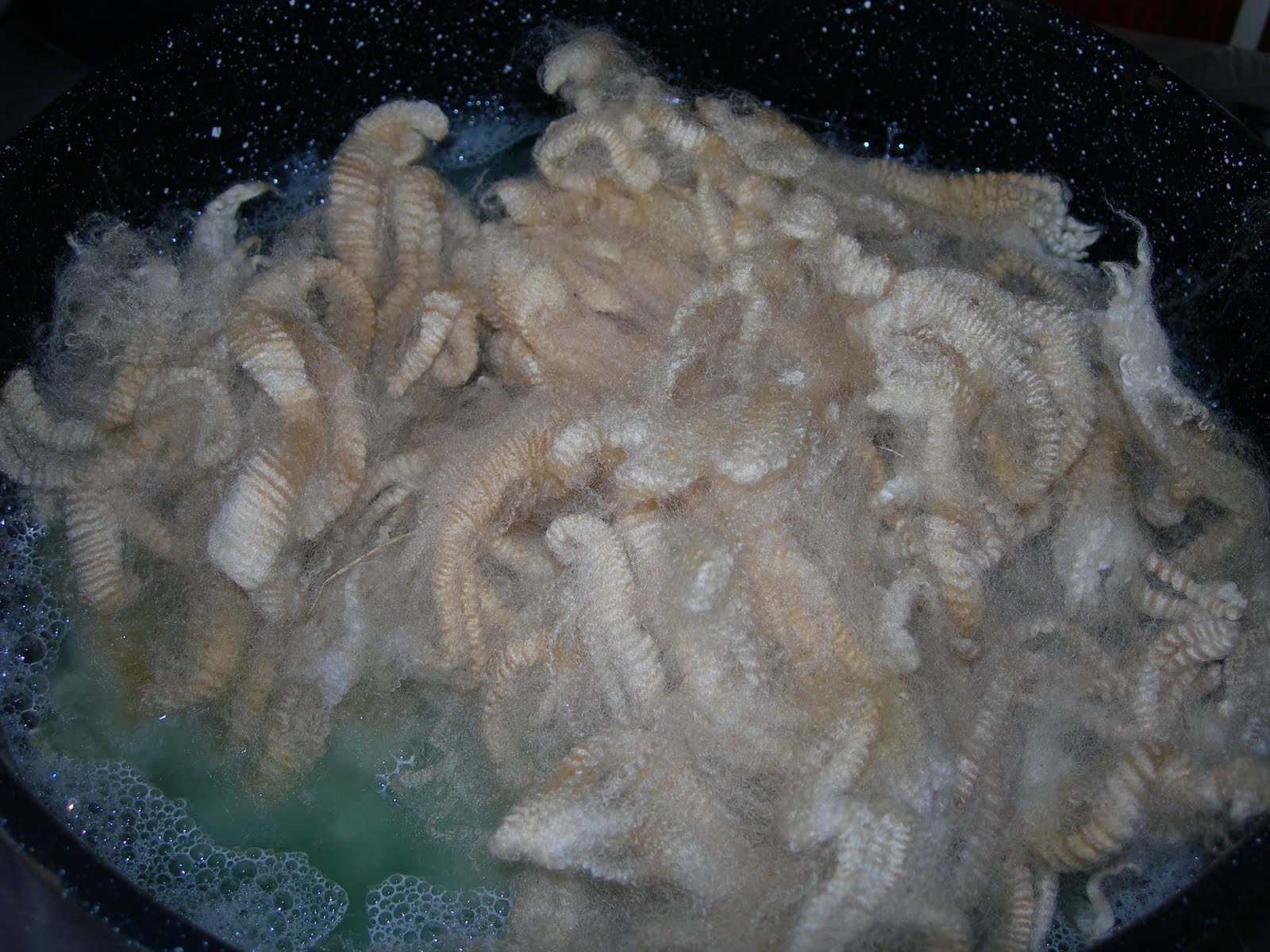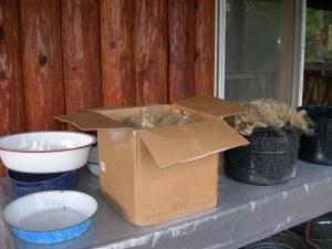 While out on the porch this afternoon, I thought I’d get some wool soaking. Oh No! I’d forgotten everything on my “outdoor studio,” (lakeside porch, just outside my weaving studio door) was covered with tree pollen. Then thinking about the predictions for rain, decided I’d clean-up today and wash wool tomorrow. After wiping down the plastic sheeting on the table, and washing some of my enamel pots (canners) and enamel basins, the sun was peaking out, so decided I’d set wool to soak in two pots, a manageable amount as it was late afternoon.