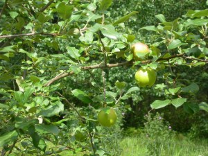 My dwarf apple tree has a few apples on it this year. I don’t recall the variety, but it is one bred to survive the subzero temps of Zone 4. I’ve yet to eat an apple off this tree, the kids always got to them first. They like green apples so they were eaten before I considered them ripe. This year, they were “warned” to leave the apples alone! I’m hoping there will be enough for an Apple Pie or a pan of Apple Crisp.
