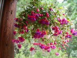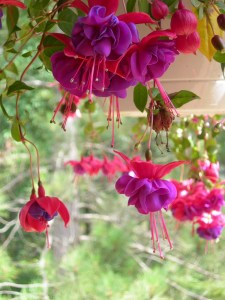 I’ve been seeing a hummingbird visiting the fuchsia frequently so thought I’d get a few photos of the blooms before they fade. While taking these pics, to my amazement, I was buzzed all the way around by the hummer! Ah,… I’m wearing a bright red shirt working out here today!
