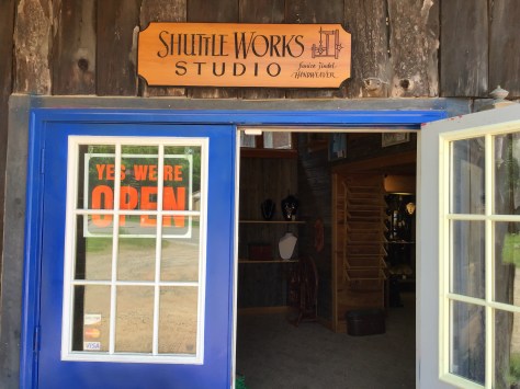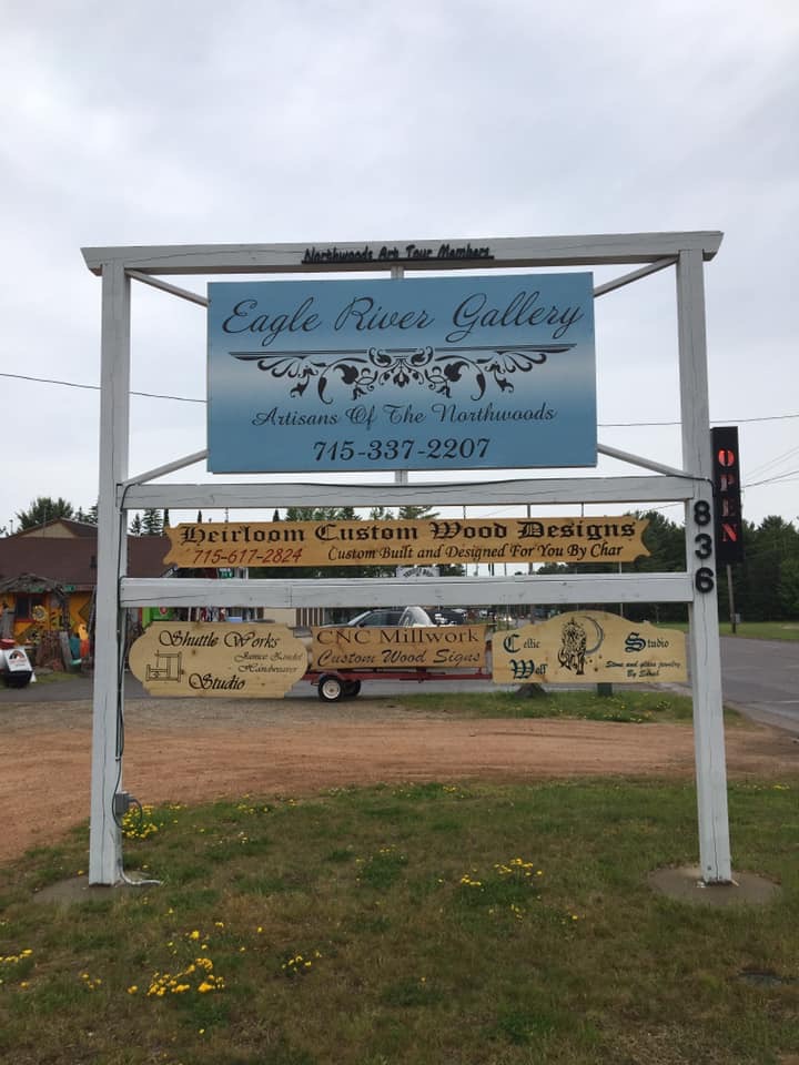 The building was originally built by a potter, and what is loosely termed “the garage” was where his kiln was located.  Over the years there was also a sign business, then a real estate office.  The most recent reincarnation has been “Eagle River Gallery” owned and run by my daughter-in-law Char (woodworker, sign maker and more – Heirloom Custom Wood Designs) and daughter Sarah (stone jewelry maker – Celtic Wolf Studio).  And now home to Shuttle Works Studio!   Thanks to Char, we now each have our own sign hanging under the large Eagle River Gallery sign, at 836 W. Pine Street, (Hwy. 70 W.), Eagle River, WI 54521.