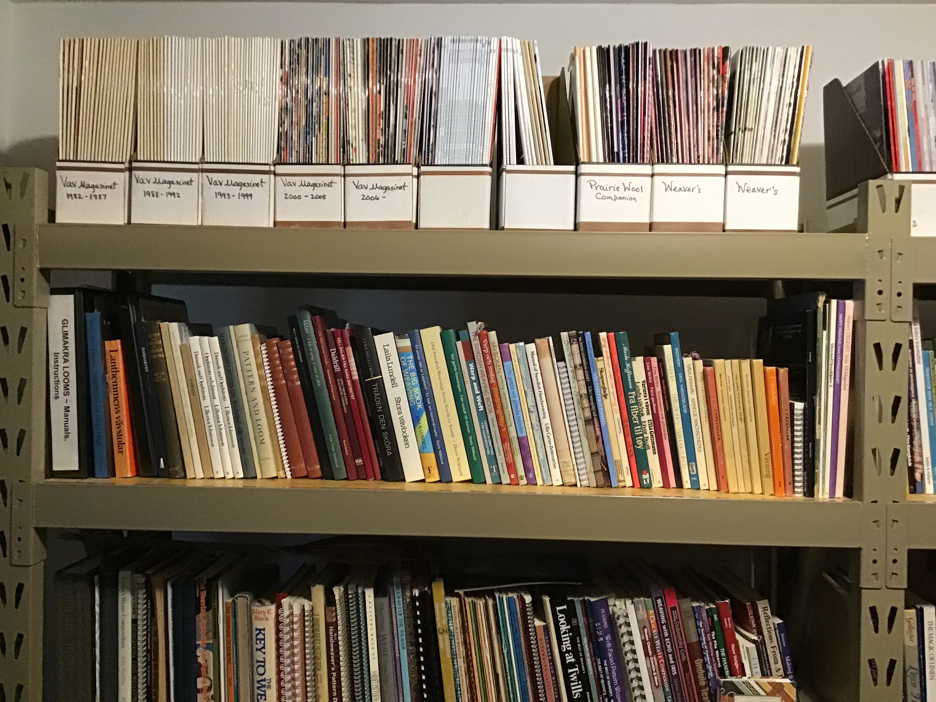 In the studio portion I have a long workbench, part now used as the “office,” the rest for sewing, cutting, or other creative work.  There is a tiny kitchen, and a room now known as “The Library,” where my weaving/spinning/dyeing/felting/fiber art reference library lives.