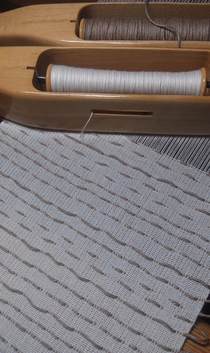 A drawloom is a double harness loom. In the photo above, starting at the forefront of the picture, you see white cotton warp, the beater, then the first harness, a set of shafts that have long-eye heddles, and further back is the second harness with the pattern shafts.