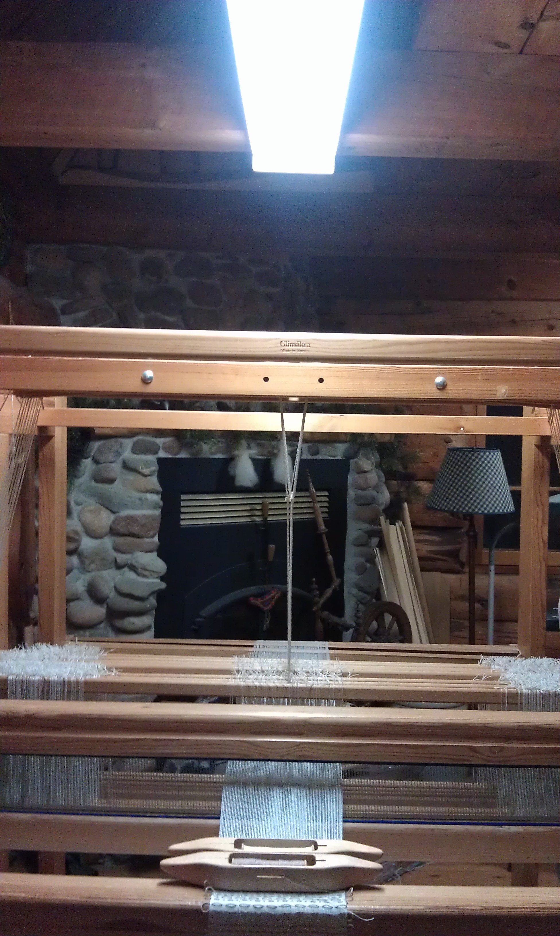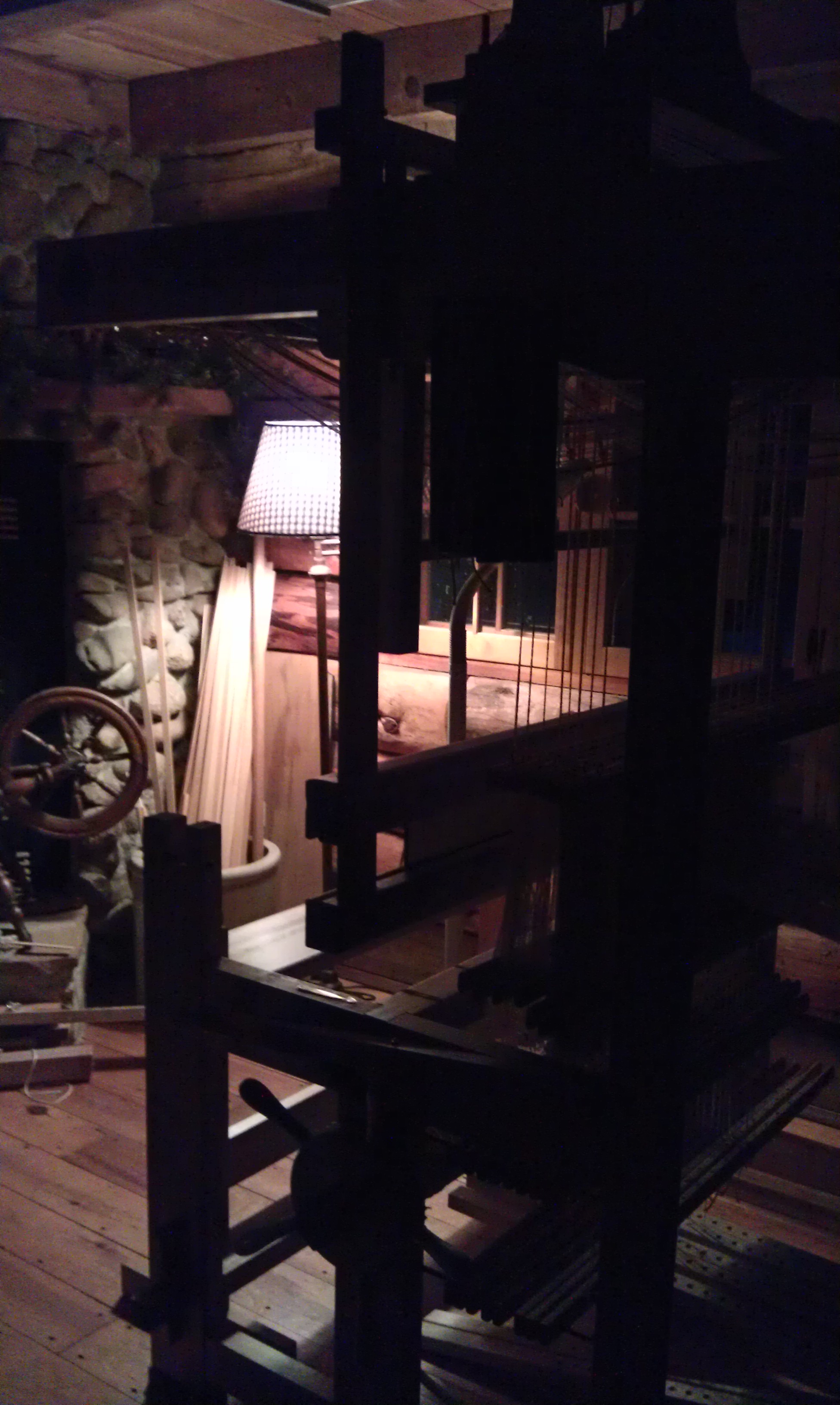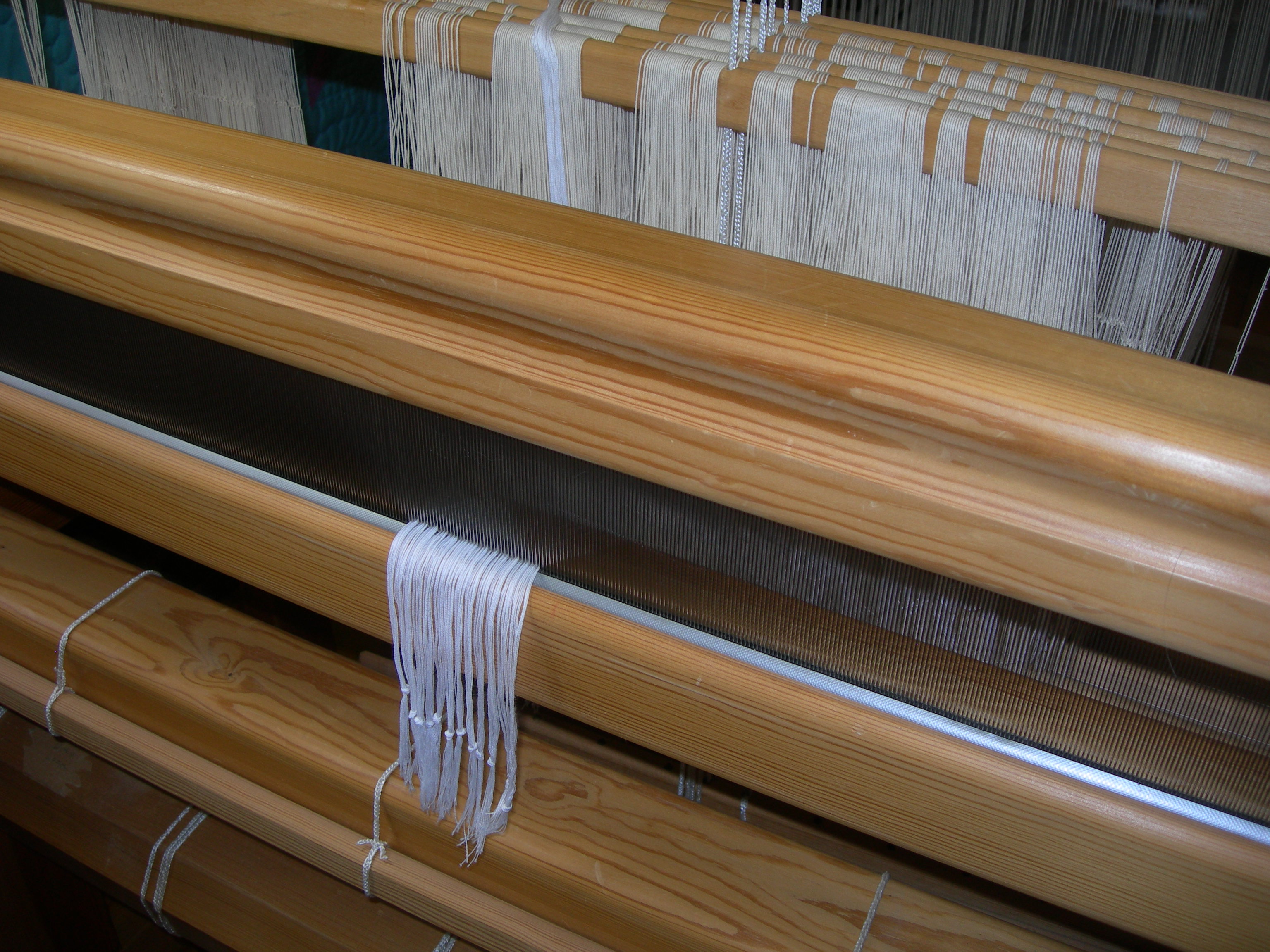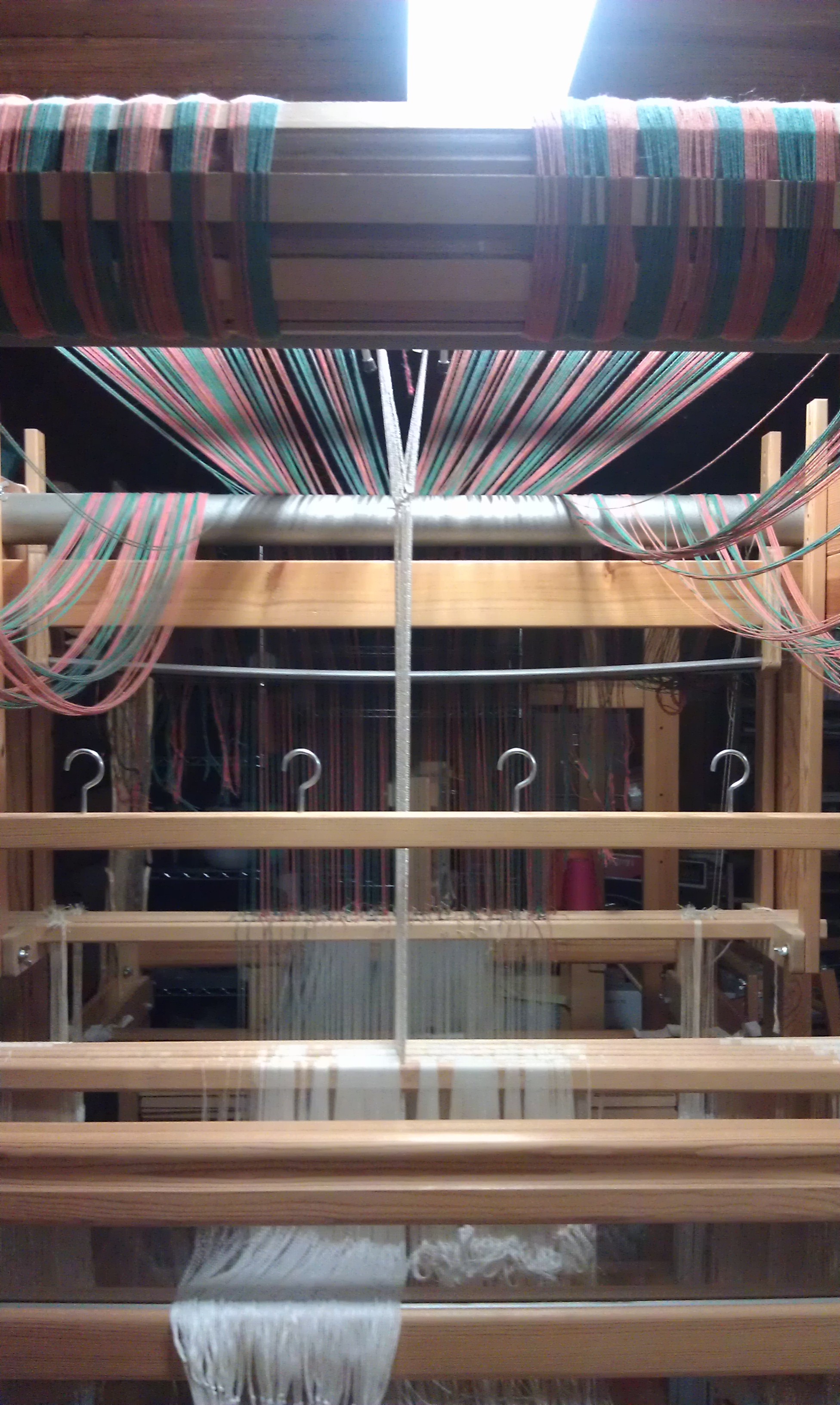 This afternoon we were back at the loom, and having more success. It was interesting how a change made at the top would cascade down into changes to shafts, then lamms, and finally treadles. When we stopped today, knots had been re-adjusted on all the heavy counterweights, and shafts were doing better at returning to “neutral.”