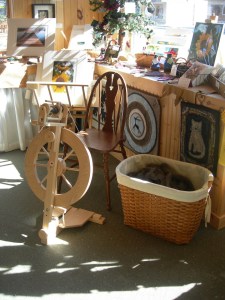 Today was a work at the gallery day for me and I took a spinning wheel and basket of Coopworth roving to work on, along with the book “Damask and Opphamta” and printed out notes (emails) from several drawloom weavers offering suggestions for adjusting my drawloom. They enabled me to list everything I need to check and adjust on the loom to get it working properly. A good, productive day!