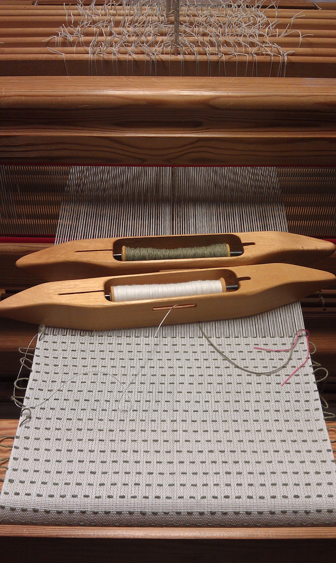 Random single threads showing (white) should not be there. It was suggested to me to re-sley to a bit wider sett, so I need to do a bit of research for sett for 16/2 cotton in satin weave. With more sunny days (I hope!) it would be a good time to do this, then enjoy weaving in the sunshine.