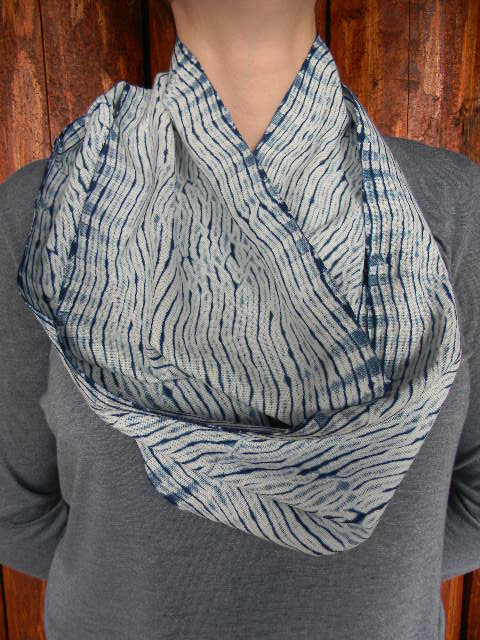 Woven shibori mobius scarf, indigo-dyed.Detail shot of the woven shibori mobius scarf.