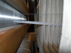 After changing the lamms, I’ll tie up the treadles again (only 2 cords on each treadle on a drawloom). Then I’ll tie the heavy counterweights back on, one tied to each horizontal jack on each side of the loom. Their purpose is to pull the raised and lowered ground shafts back to neutral. And this is what I have not yet achieved.