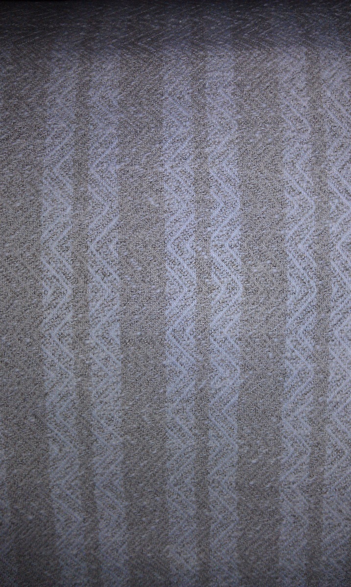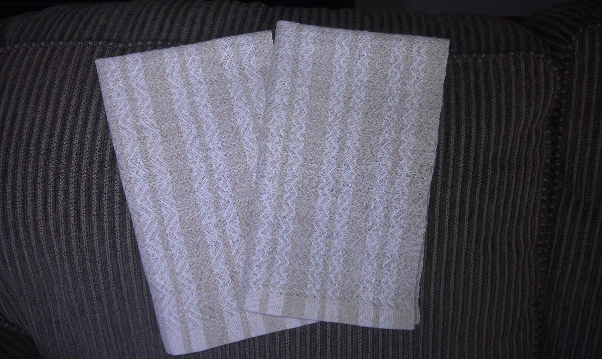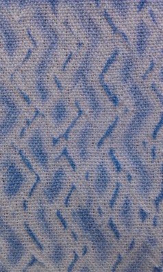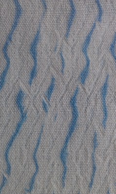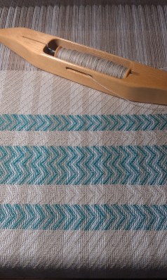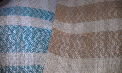 While pressing the first time I noticed what appears to be tracking, something I was not expecting. I’ve had tracking happen twice, once with Harrisville wool singles, another time on a towel with cottolin warp and cotton weft (which gave a couple short diagonal lines. I’ve woven many cottolin towels, plain weave and twill, and never had tracking occur. A third steam pressing this afternoon helped a bit, but the tracking seems to be here to stay, and actually, I like the textured look it is giving to the borders. The tracking is not on the plain weave hems and plain blue areas, only the woven shibori borders.