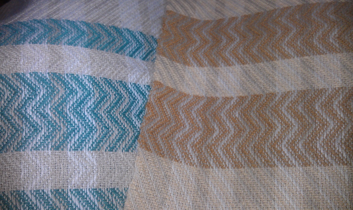 Additional note: I just looked at the first scarf and samples. Tracking does not appear on the samples woven on the twill threading, but there is tracking on the first Monk’s Belt warp, on the dark indigo scarf and the samples, just not as visible because they were dyed darker shades of indigo.