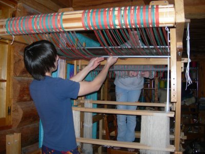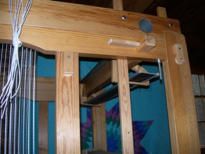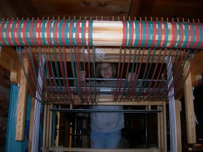 With help from daughter Sarah and son Noah (so I could take photos), the reed (with lease sticks still in) were passed to the back of the loom, over and down behind the round steel beam.