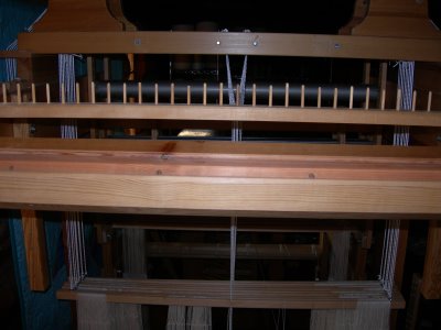 I had previously sleyed the 440 cords (seine twine, two colors) through the reed shown suspended from the upper drawcord warp beam.