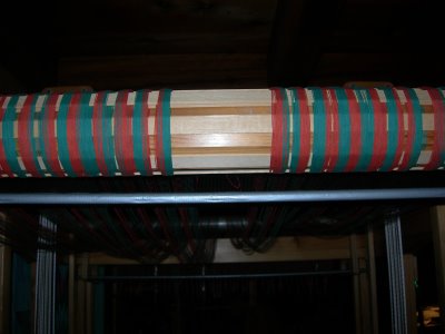 This afternoon I pulled the long Texsolv cords, that go from the upper jacks and down through the shafts to the lamms, out of the shafts and wrapped them up around the top. Though I had previously read how to put a drawcord warp on, on p. 149 in “Damask and Opphamta,” I went about this slightly differently.