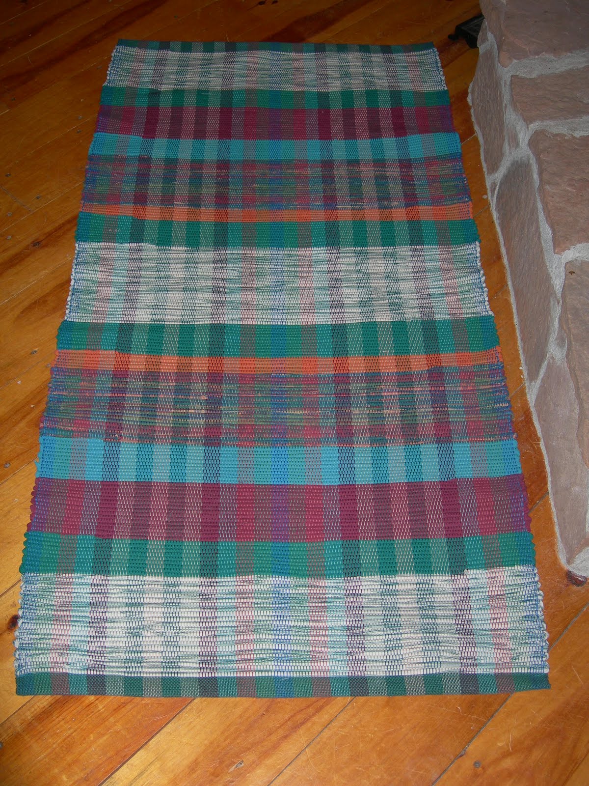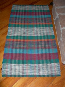 Here it is, my first real rag rug completed and on the floor! Looking at it now, I like the warp stripes and colors, as well as the weft colors. It lays quite flat, selvedges are nicely even, and only a tiny bit of “smile.”