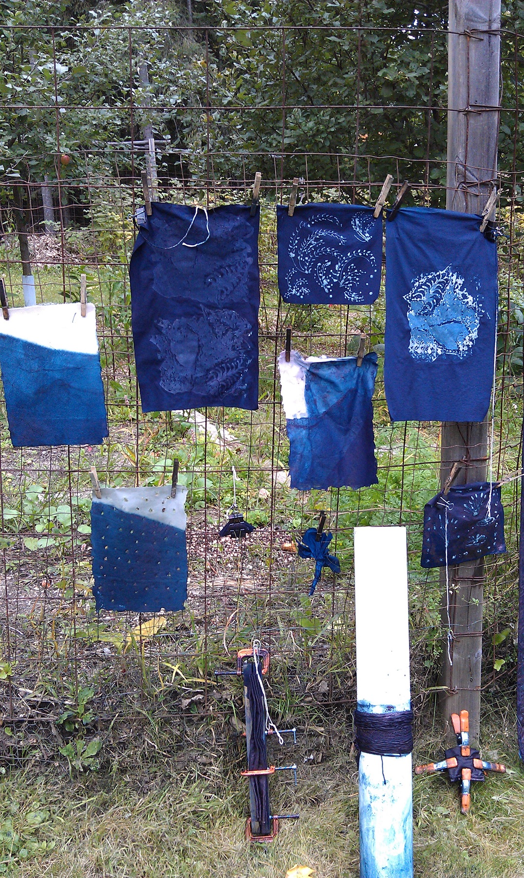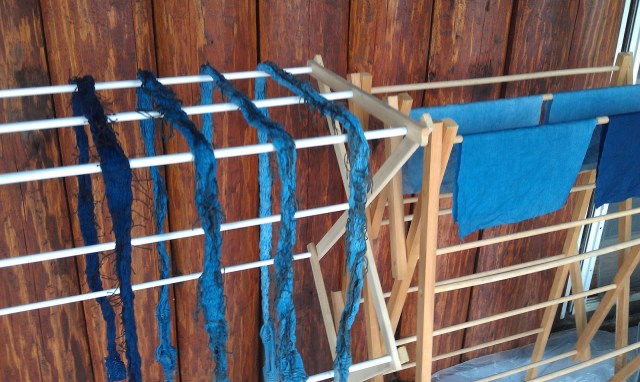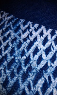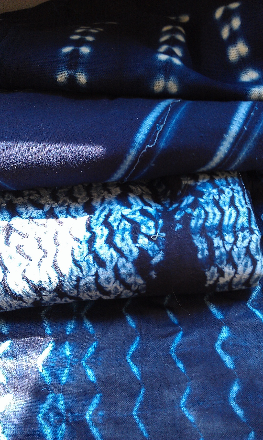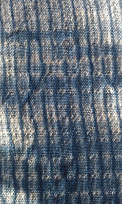 I try to get various shades of indigo, some solids, some mottled, by scrunching the fabric up in my gloved hand and immersing it once or twice, different lengths of time. They are being used for smaller items. When I have more specific ideas and plans, I’ll do some proper shibori.