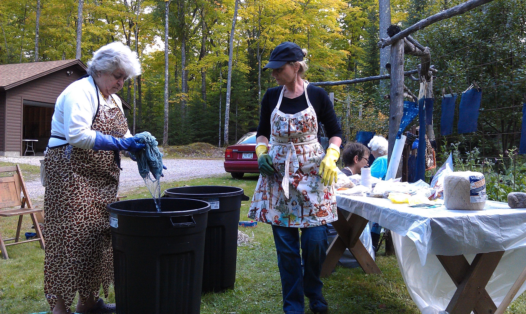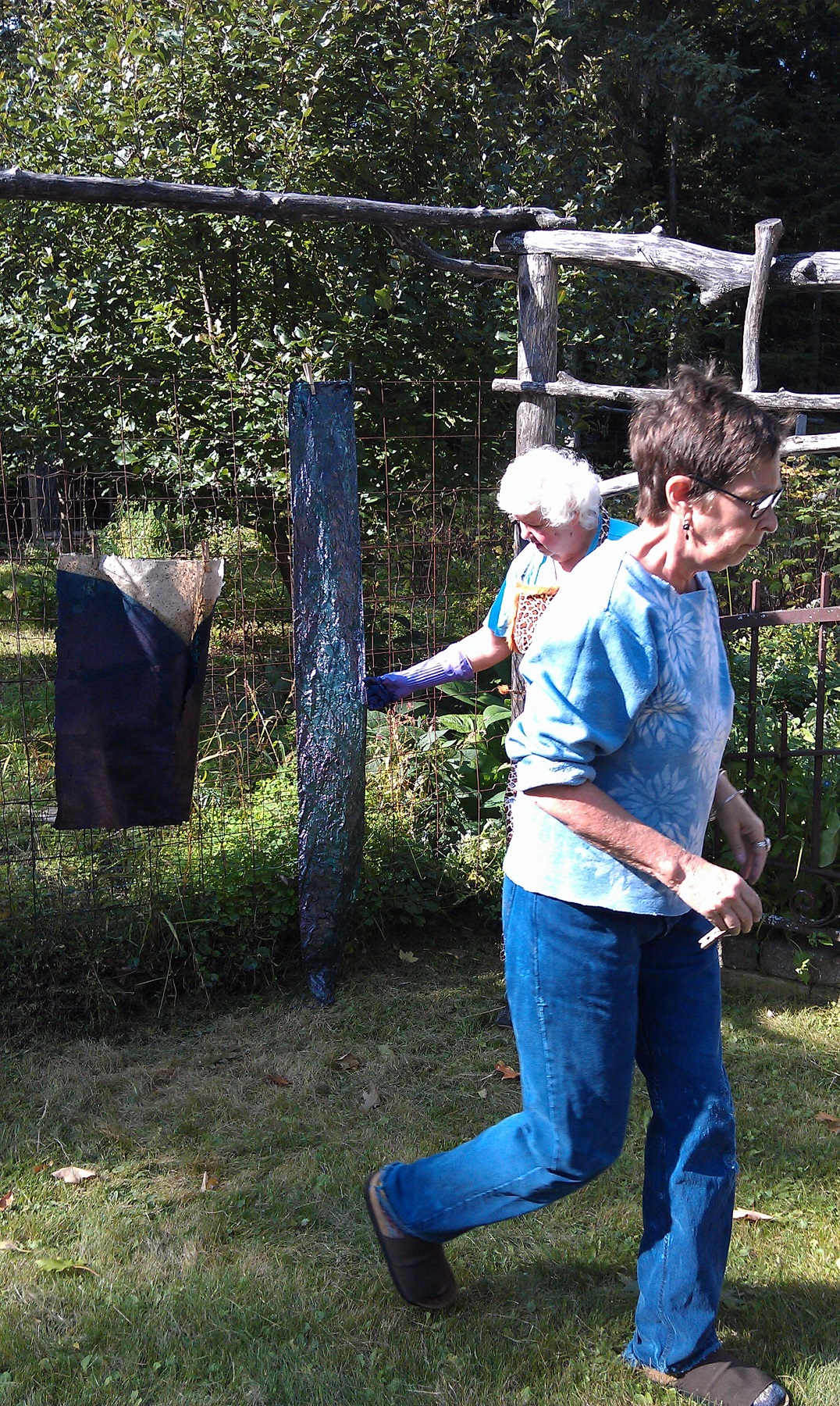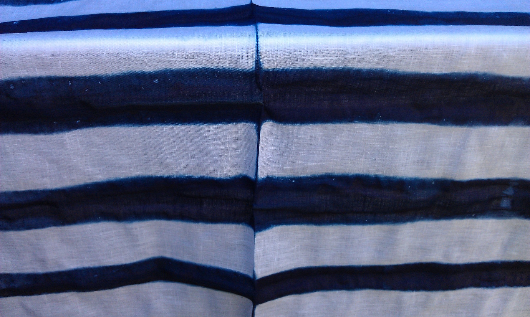 I try to get various shades of indigo, some solids, some mottled, by scrunching the fabric up in my gloved hand and immersing it once or twice, different lengths of time. They are being used for smaller items. When I have more specific ideas and plans, I’ll do some proper shibori.