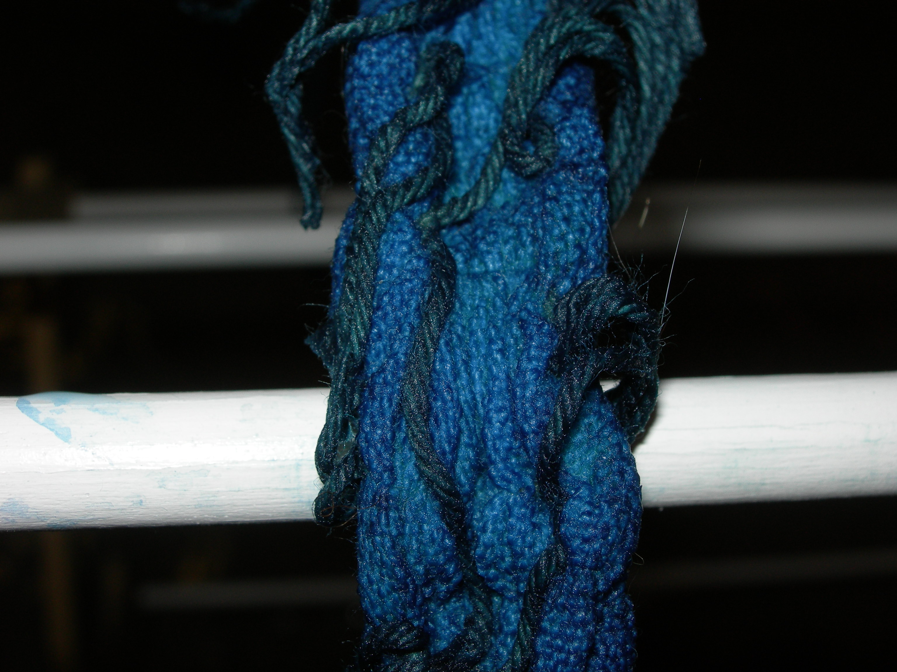 Before immersing my handwoven scarves and cowls in the indigo vats, I “test” the color with small swatches of PFD cotton. These (above) are what I have left after using several for sachets.