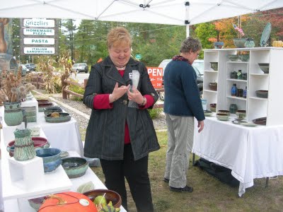 Kathleen Kimball, Salmagundi Arts, is a collage artist and soapmaker. On Saturday, however, she was working in The Studio Gallery. During slow times, she joined us out front in the sun and sat knitting on a sweater. I love how all these artists are known for particular areas of art, yet surprise you with what else they enjoy doing!