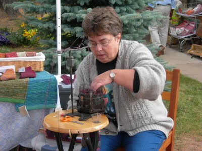 Louise Engelbrecht, Black Squirrel Studio, painter and weaver, had brought a table loom and sat threading the heddles. Unfortunately, she left early in the afternoon before we brought out the cameras.