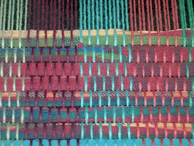 Details: 8/4 cotton rug warp, sett 12 epi. Good tension when weaving, beat hard, change sheds, beat hard again, and I used a temple. Weft strips are sheets purchased at thrift stores, cut into 1 1/2″ strips and the strips were sewn together. When winding the ski shuttles, I wound the weft on folded in half and when placing the weft into the shed, made sure it was still folded.
