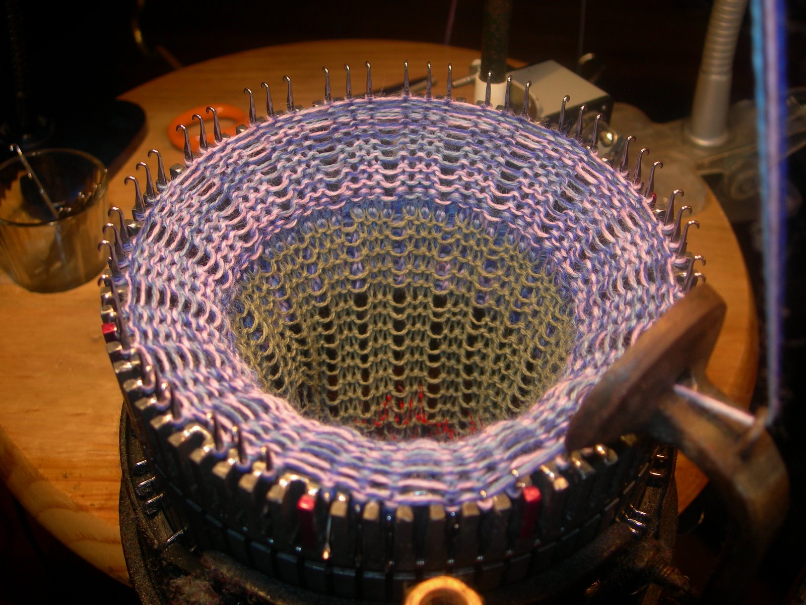 Today was another cranky day, on the sock machine, that is. This evening, I’ve been closing toes and washing completed socks. Now, later this evening, I am closing toes on three socks made at the demo this past Friday evening. I am not entirely happy with one pair, which were requested to be made in red and black. Since I work with three colors at once, she added navy. In the finished socks, the red and navy dominate, the black recedes. So, tomorrow morning I’ll be trying another pair, and hopefully have another cone of black yarn; she’ll then have her choice. There should be a pic or two of the finished socks in a couple days. We’re not using our woodburning kitchen range yet, which helps the socks dry quickly, so drying time will take an