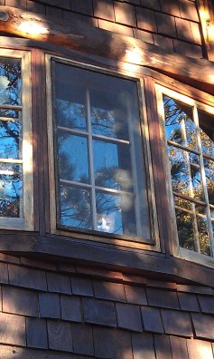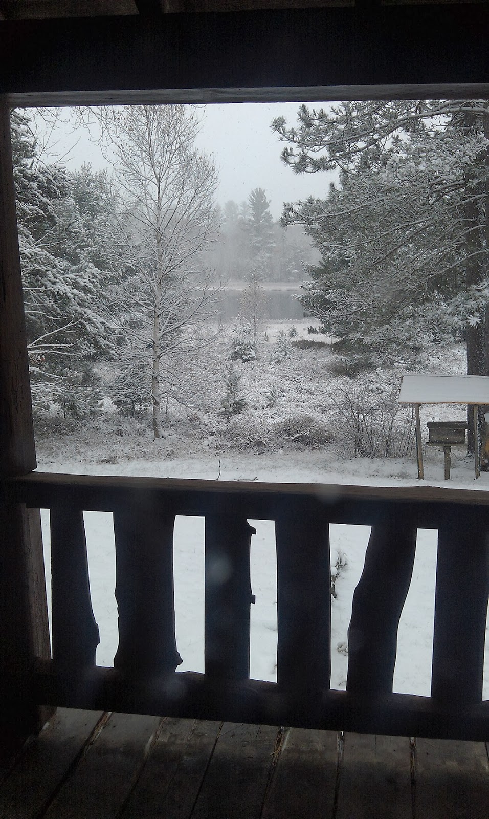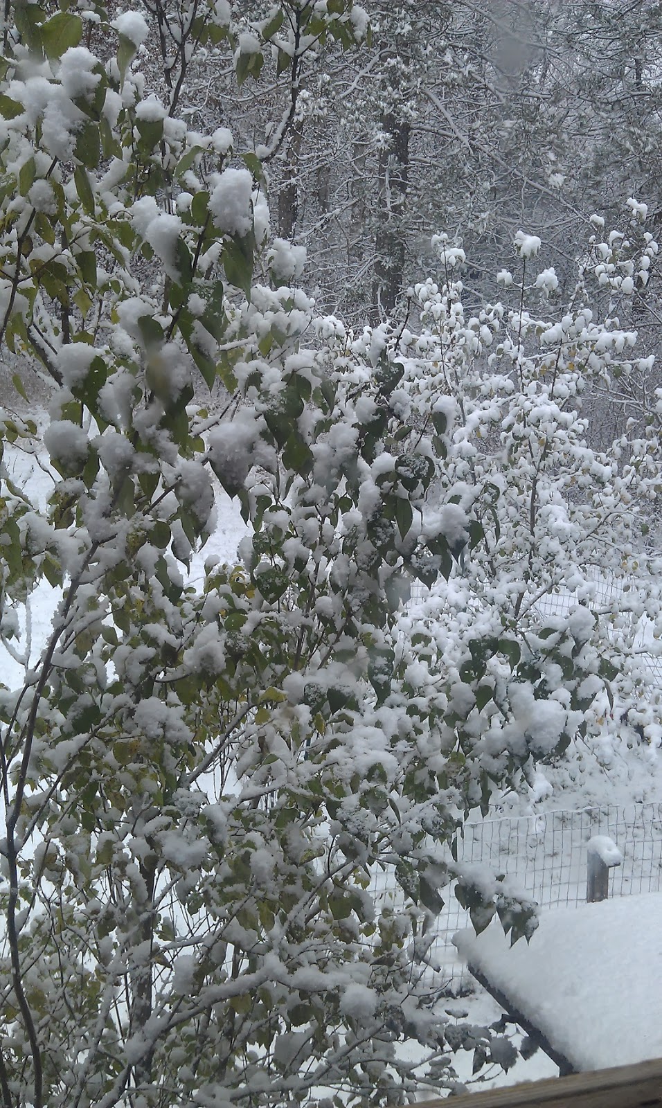 | From my bedroom window, leaves still on the lilac, now snow-covered. |