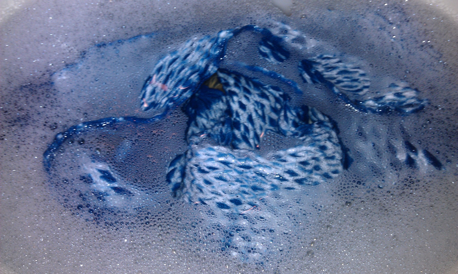 At that point, the table, indigo vat, and supplies were moved to a workbench and vintage metal cupboard in the garage. That didn’t work quite so well as Char had her woodworking shop in the garage. Things were usually covered with fine (saw)dust. And though the garage gets a bit of heat in winter, subzero temps made it too cold to work out there. So, when I needed to dye with the indigo, I’d bring it in to the kitchen near the wood burning range, about 24 hours in advance of dyeing, so things could warm up.