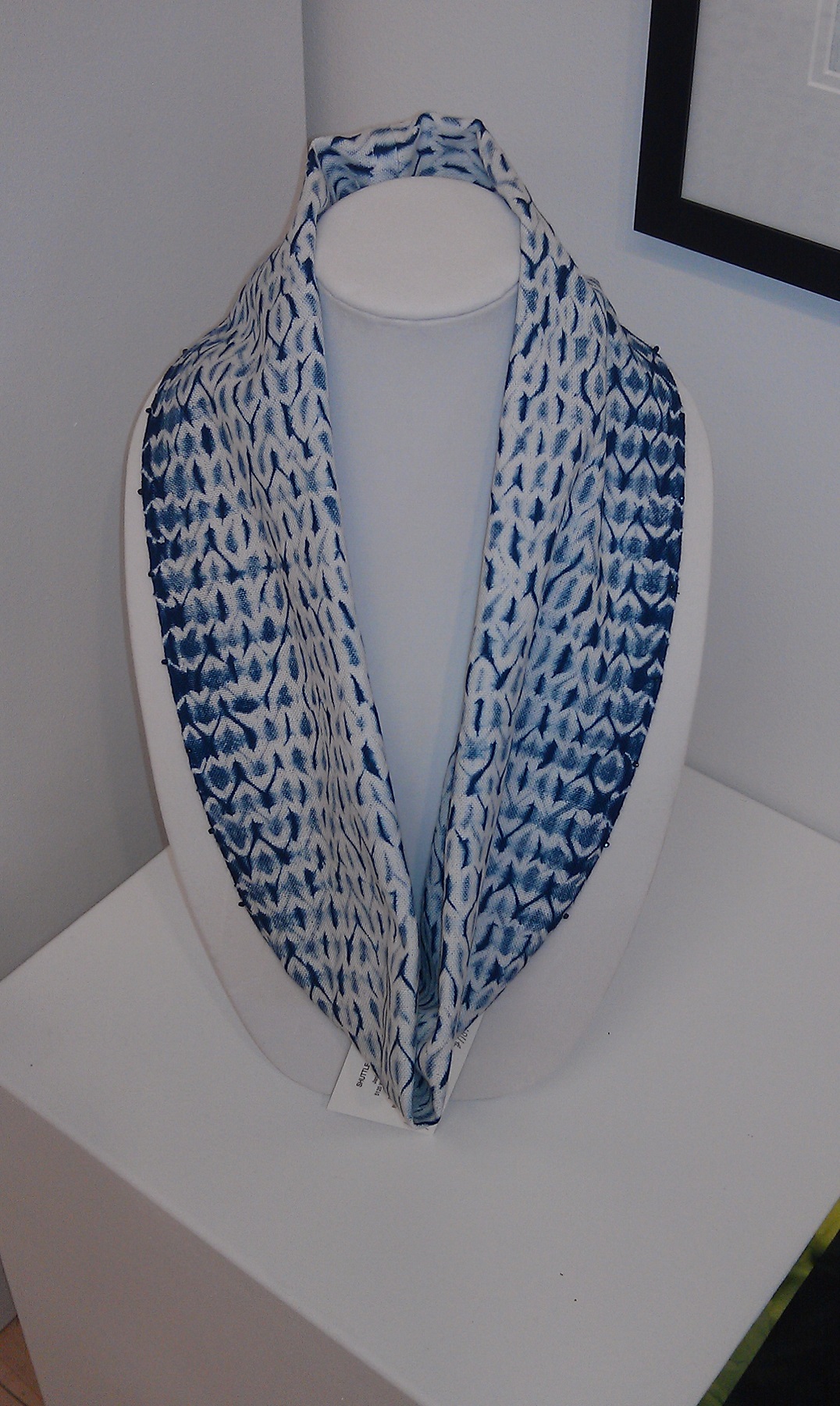 Woven shibori circle scarf, embellished with indigo-color glass beads along the long edges.