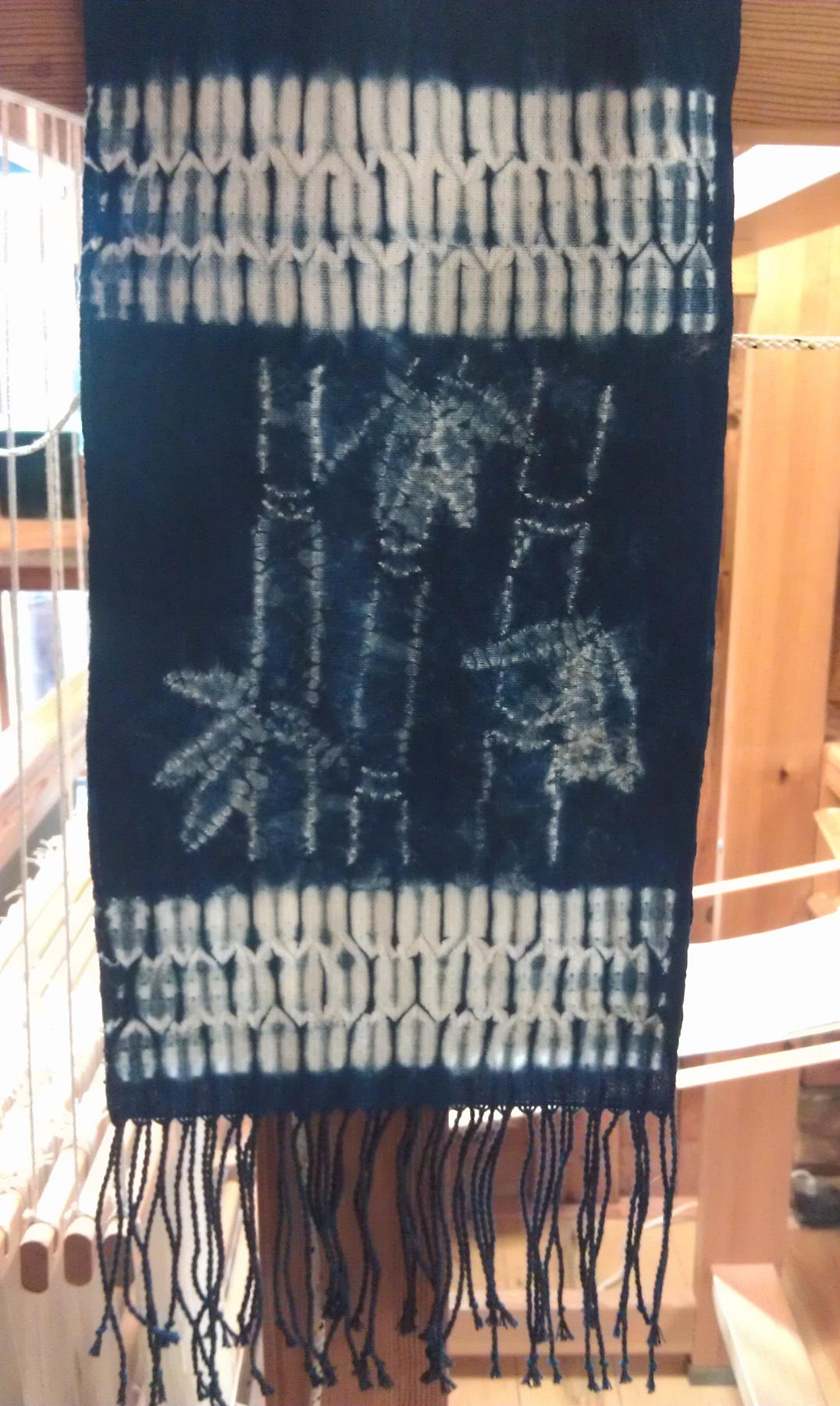Woven Shibori scarves are handwoven with 100% Swedish Bockens cotton, and indigo dyed, are hemstitched on the loom, and have fringe that was twisted by hand. Scarves start at $115+ depending on fiber and size, and if any embellishment has been added.