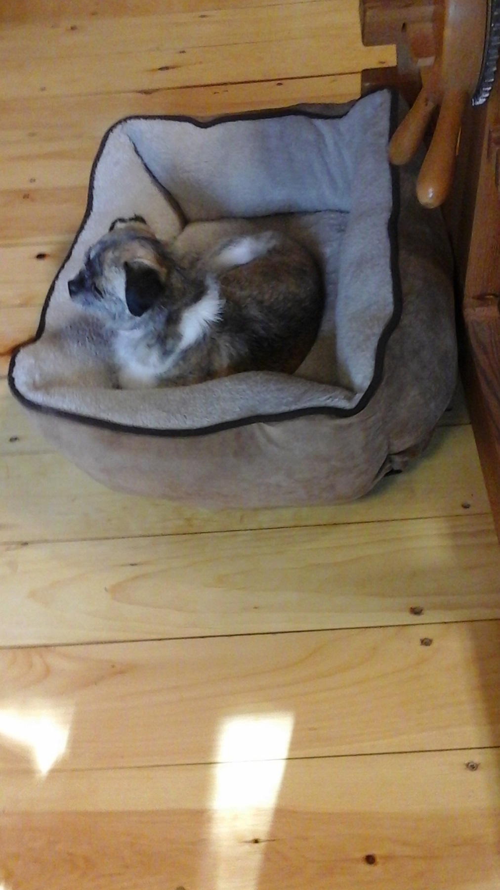 Earlier in April, I had applied to adopt a little dog, mixed breed, that no one else seemed to want as she has secondary epilepsy. I picked Keda up in Green Bay, a slight detour on my way home. Then came a few weeks adjustment for both of us. Her meds was also adjusted, and things have improved. She is a sweetie, but can be stubborn. So I now have a little companion in the studio where she hangs out in her bed, or sometimes under the rolling cart. At least she has stopped barking at the loom with each depressed treadle!